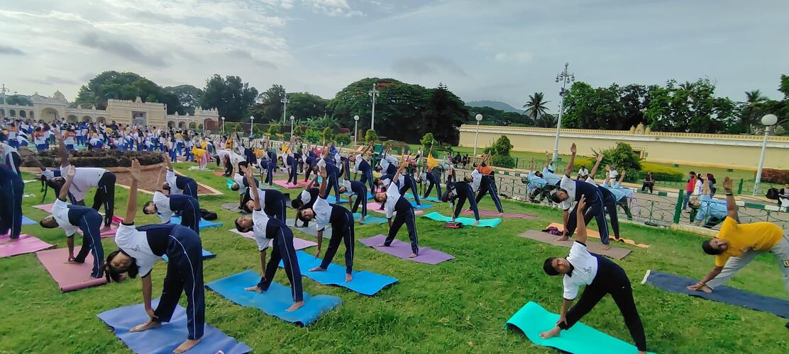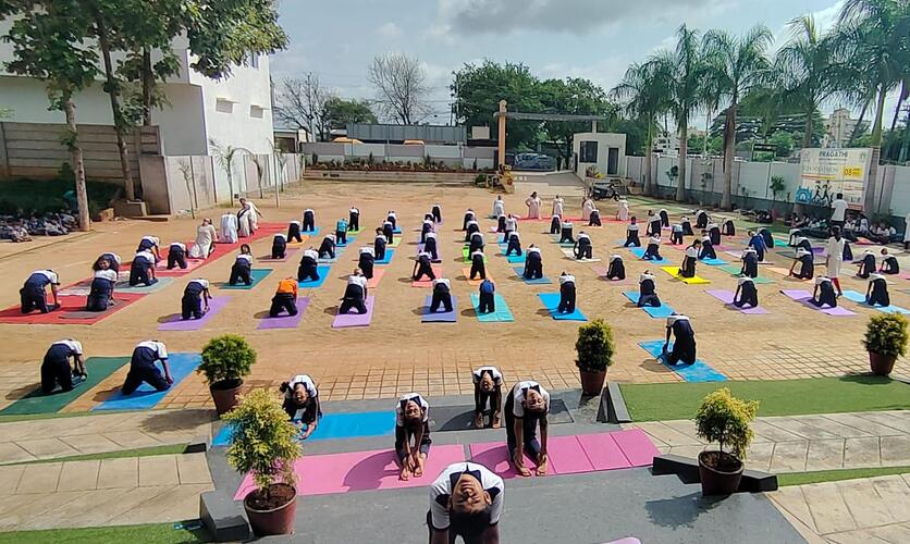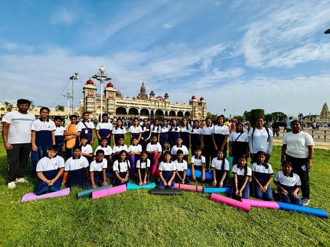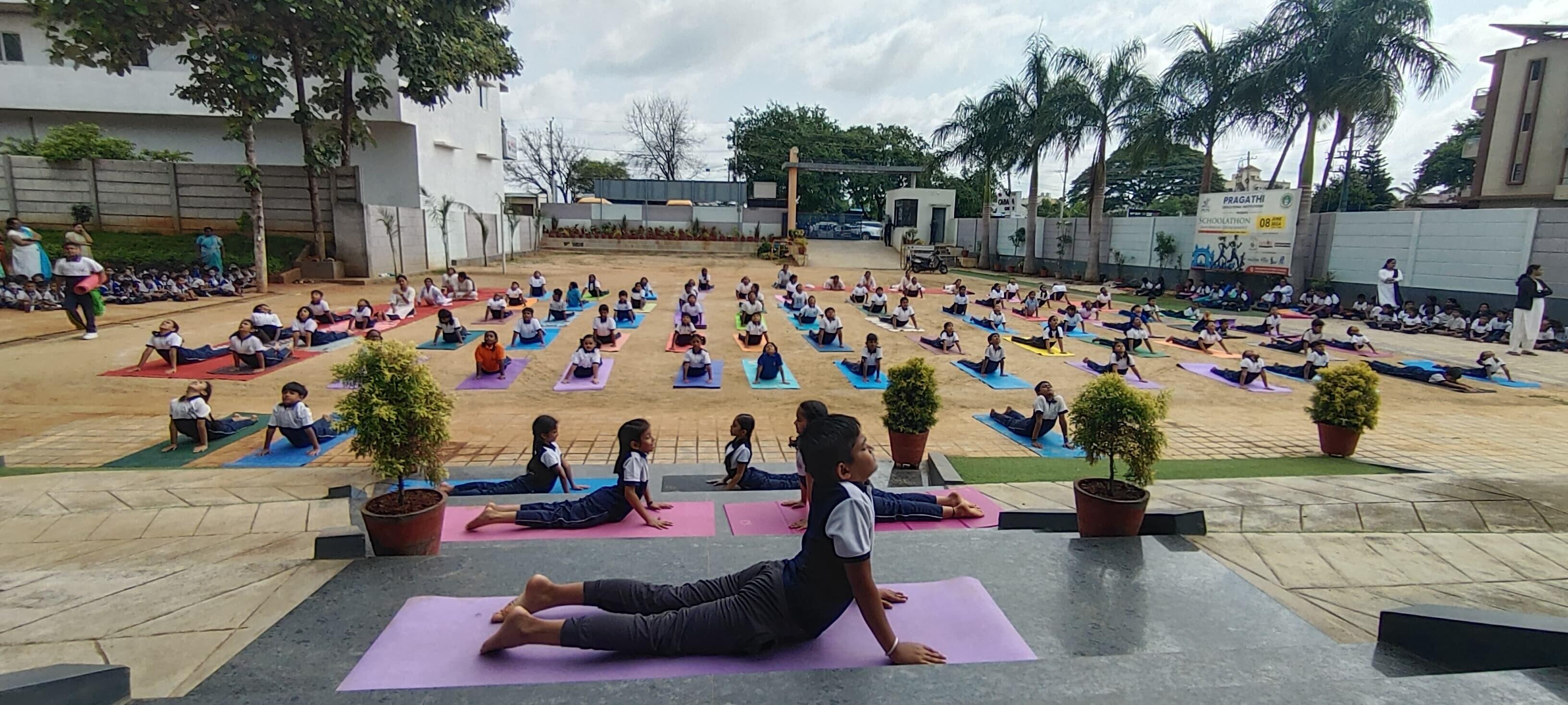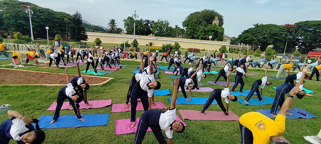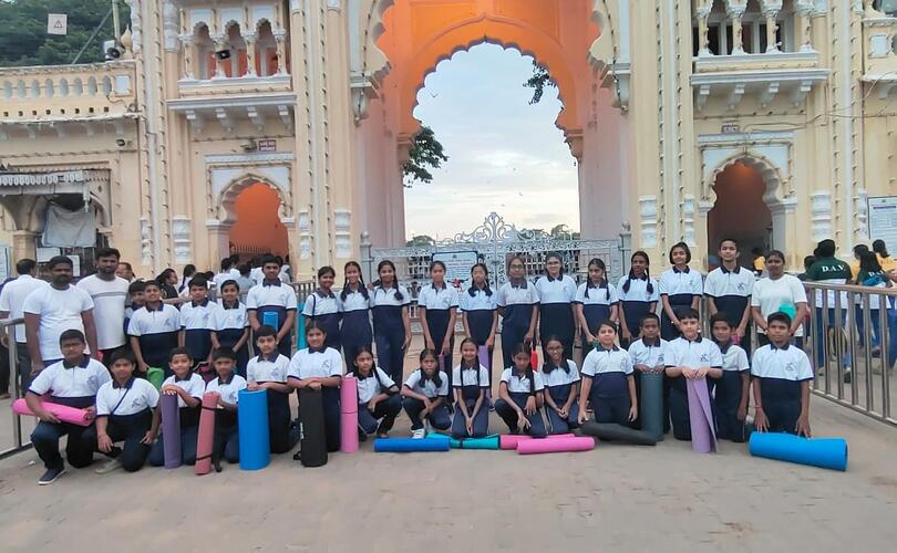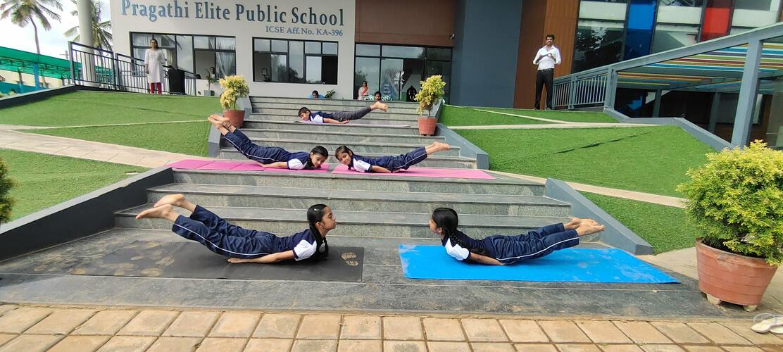 Teachers of Pragathi Elite Public School escorted students to Myusru Palace Grounds on account of International Yoga Day.